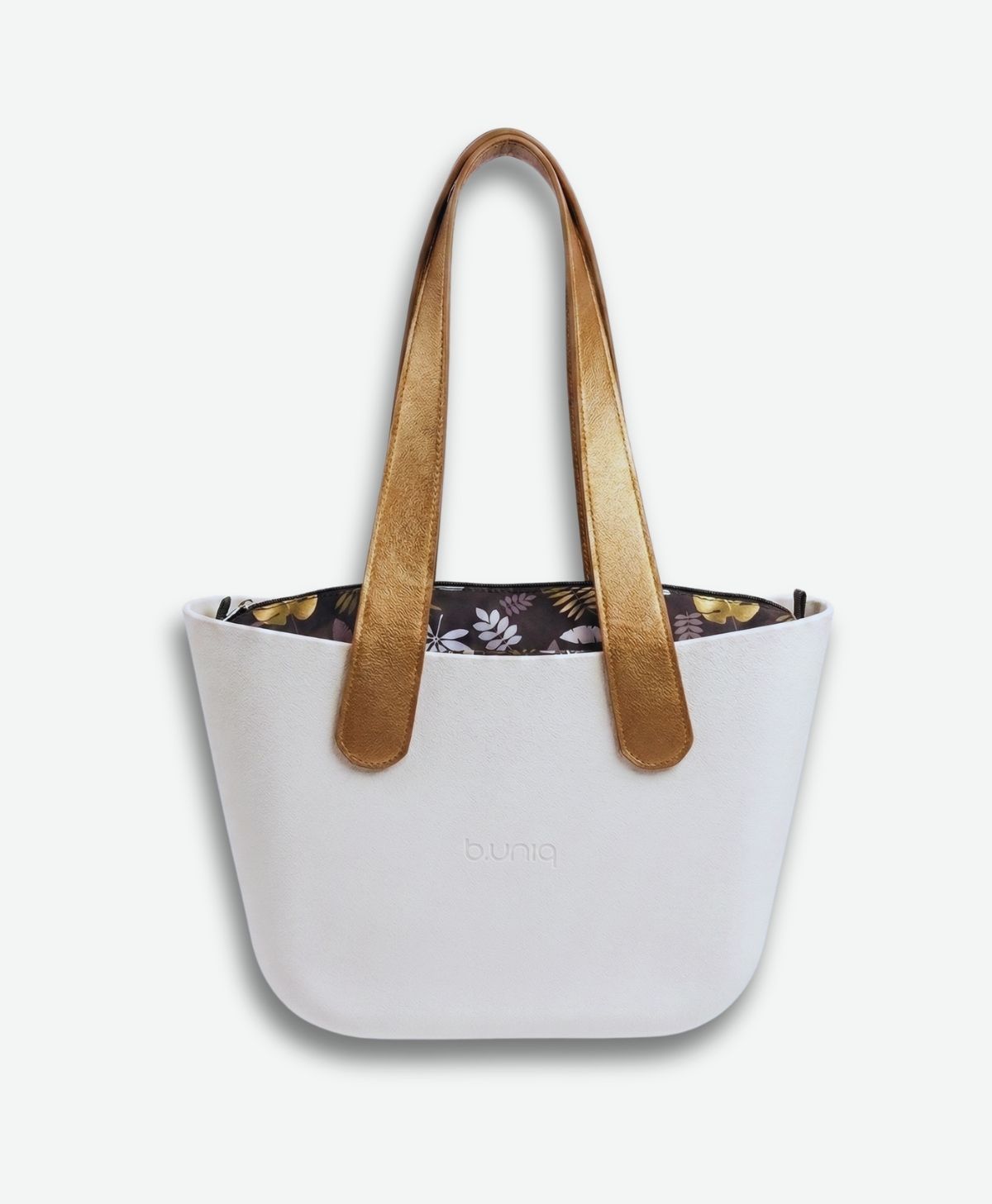 Baú b.super branco + recheio preto com folhas dourada e cinza + Alça de ombro flat dourada